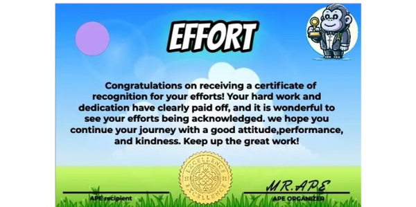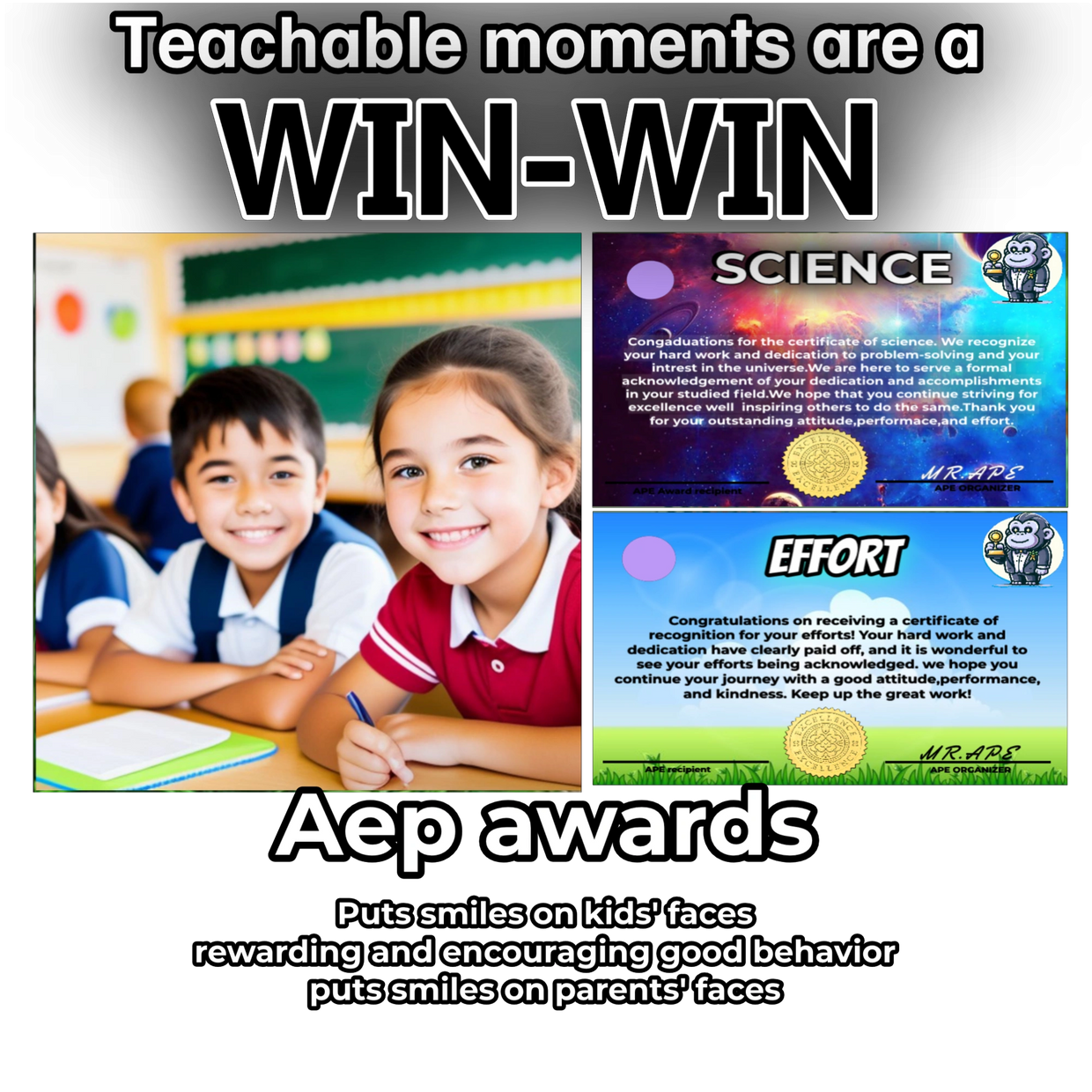 ape awards are an effective and useful way to create a one-of-a-kind way to promote and recognize a task or behavior. We want to empower children and adults to reach their full potential and understand that they are rewarded for doing a good deed or performing a task. We hope to build relationships with each AEP award winner to continue their good work and help elevate others. With ape awards, we understand that anyone can complete a task at any time and receive a trophy along with a promise to keep helping others and striving for success.